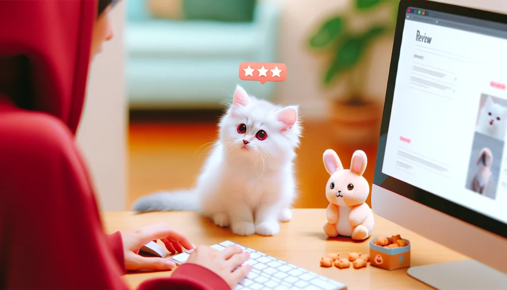 赤い瞳の白い子猫のキャラクターを使用して、以下の要件で画像を作成してください。