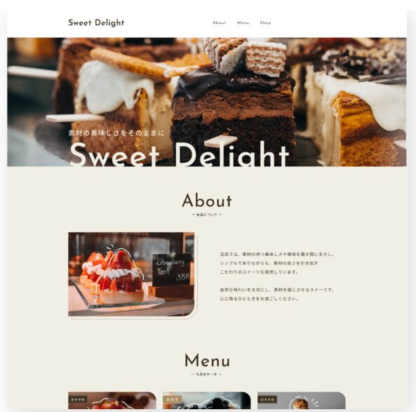 初級編の一番最初に作成した簡単なデモ作品ですら、可愛らしくておしゃれなケーキ屋さんのサイトを作成しました!